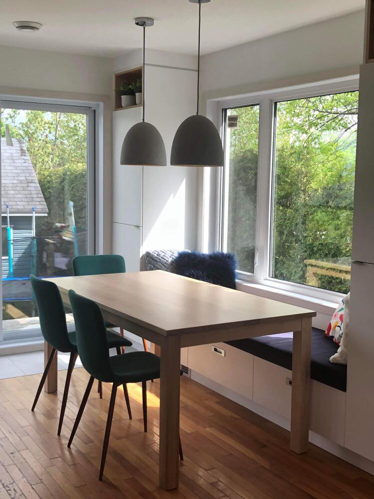 Ajout d’une banquette sous la fenêtre dans la salle à manger; La banquette est toujours une option intéressante pour gagner de l’espace.