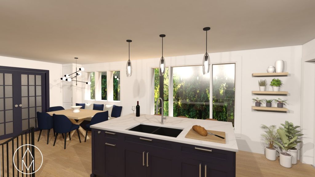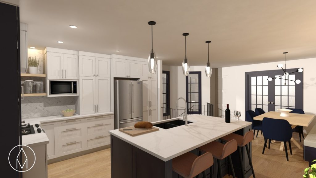 Mon mandat ici était de planifier la rénovation de la cuisine et de la salle à manger et de revoir la configuration pour offrir plus d’espace et de dégagement. L’enjeu principal se trouvait surtout entre la cuisinière et l’évier, où mes clients se retrouvaient toujours coincés.