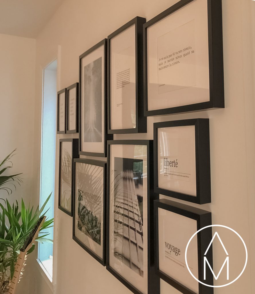 Coup de cœur pour le mur de cadres remplis de textes et de photos soigneusement choisis pour leur signification.