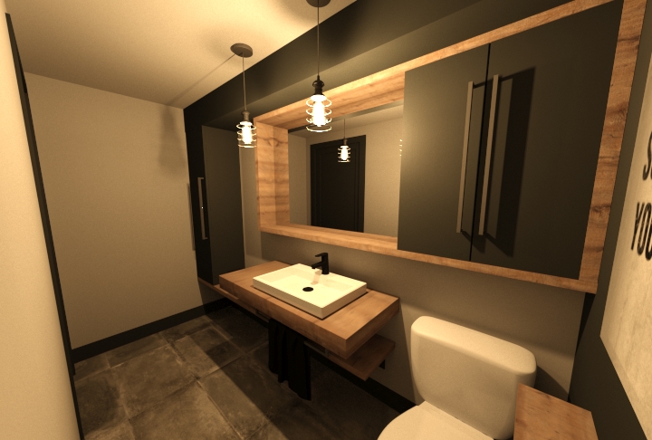 Mon mandat ici était d’aménager la salle d’eau du sous-sol. Le design a été créé en continuité avec la salle de jeux du sous-sol, elle aussi d’inspiration industrielle.